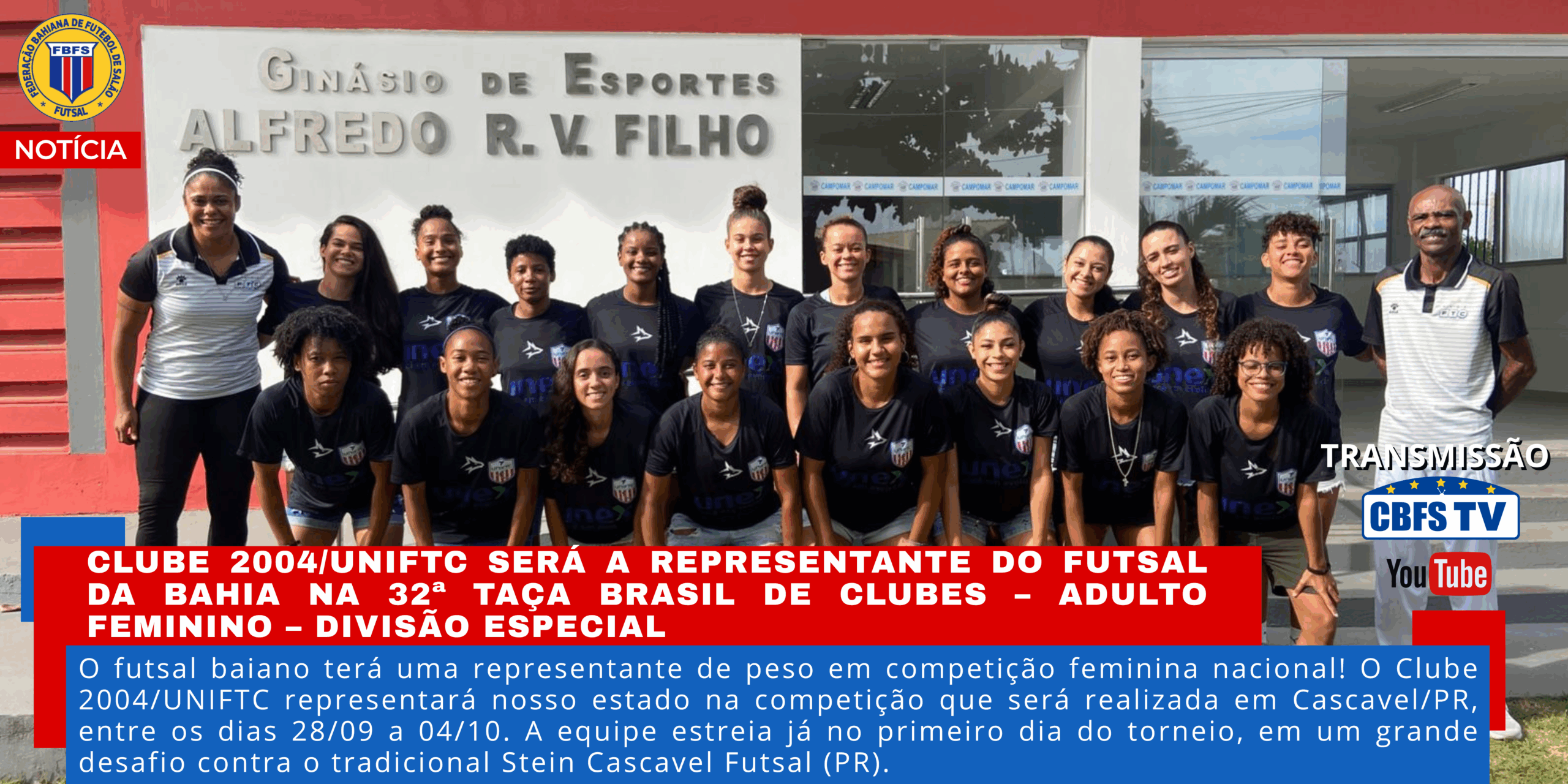 Tabela dos Jogos – TABELA DA TAÇA BRASIL DE CLUBES ADULTO FEMININO DIVISÃO ESPECIAL – A equipe campeã baiana do ano passado, Clube 2004/UNIFTC será a representante do Futsal da Bahia na competição, que acontecerá na cidade de Cascavel/PR, de 28/09 a 04/10. A equipe está se deslocando para a cidade sede do evento, contando com apoio do Governo do Estado, através da SUDESB – Superintendente dos Desportos do Estado da Bahia. Os jogos serão transmitidos pela CBFSTV, no Youtube Click no link da tabela: TABELA DA 32ª TAÇA BRASIL DE [...]
